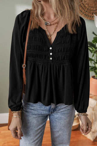 FIRST GLANCE BLACK SMOCKED BUTTON V-NECK BLOUSE **SHIPPING EXPECTED TO BEGIN ON DATE 11/5**