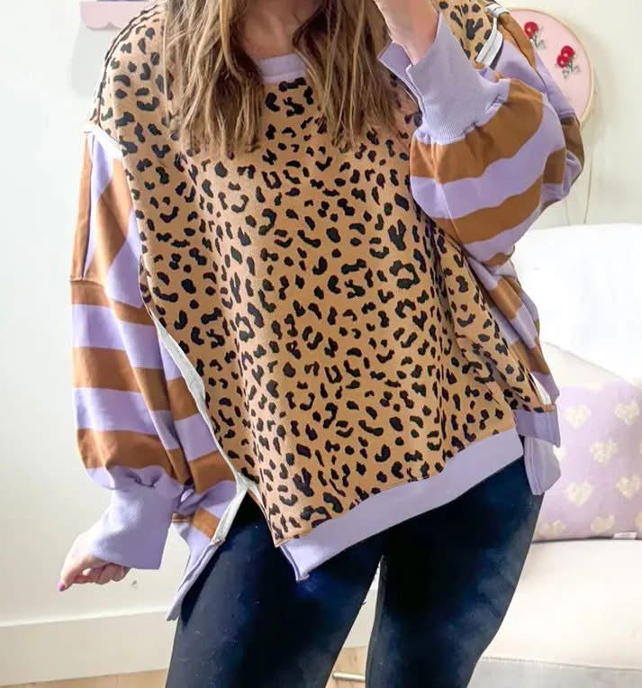 Block Patchwork Leopard Casual Sweatshirt with Slits