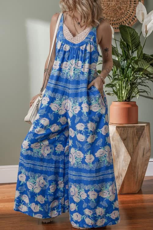 Blue Floral Wide Leg Sleeveless Jumpsuit