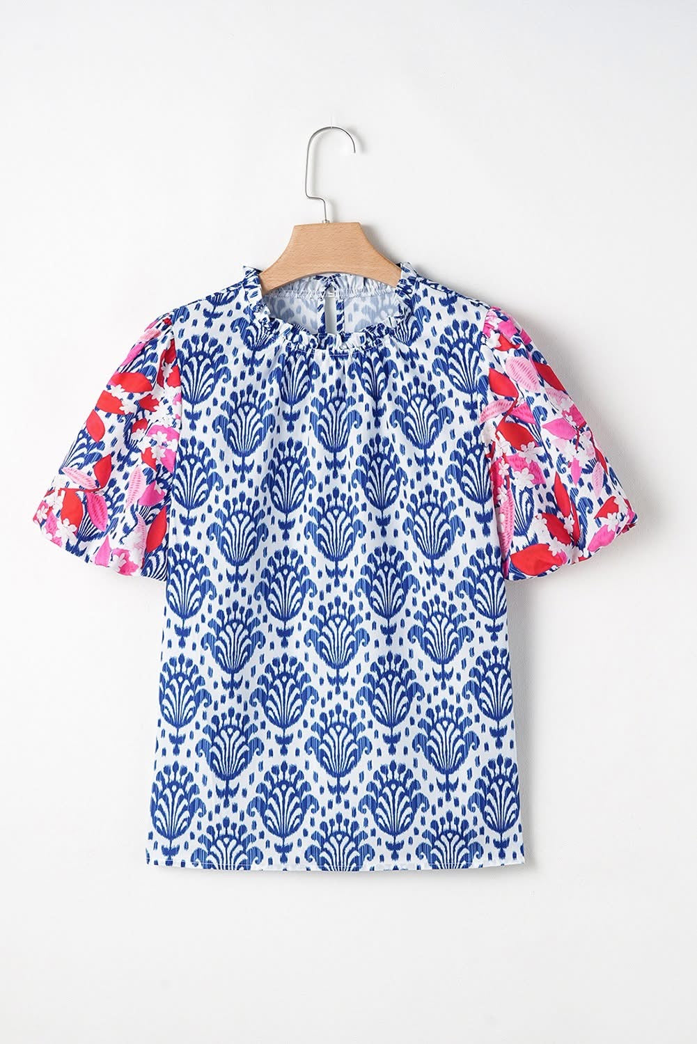 Blue Western Fashion Floral Puff Sleeve Neck Blouse