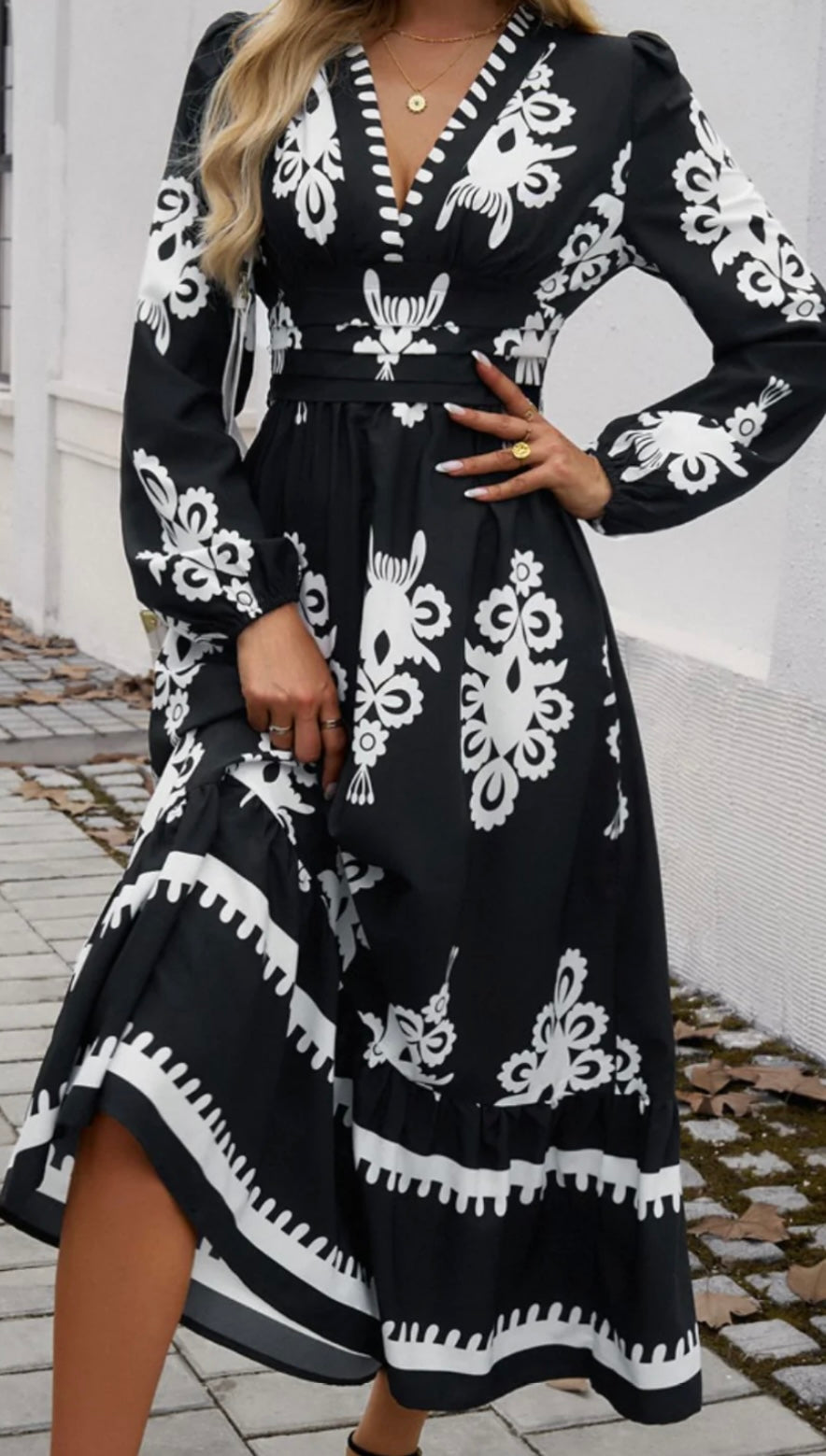 Devine Ruffled Printed Plunge Long Sleeve Dress