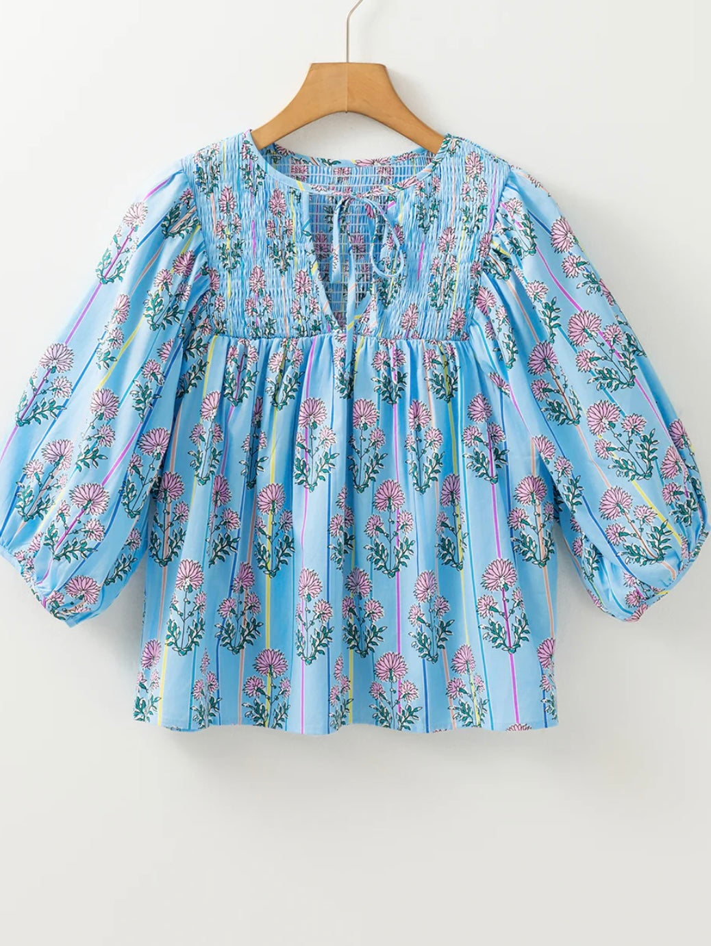 Floral Striped Tie Shirred Splie Neck Blouse