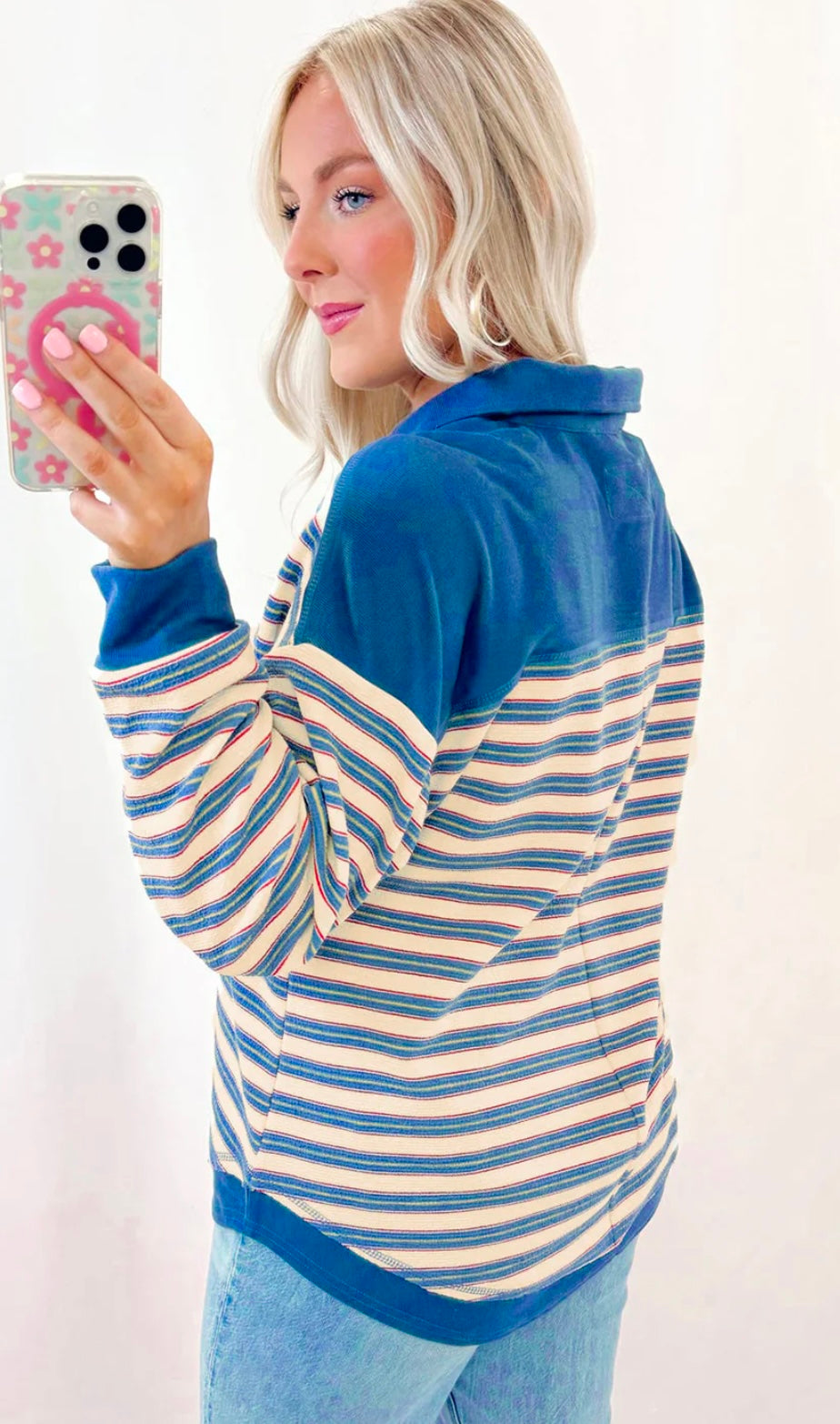 Stripe Buttoned V Neck Collared Top