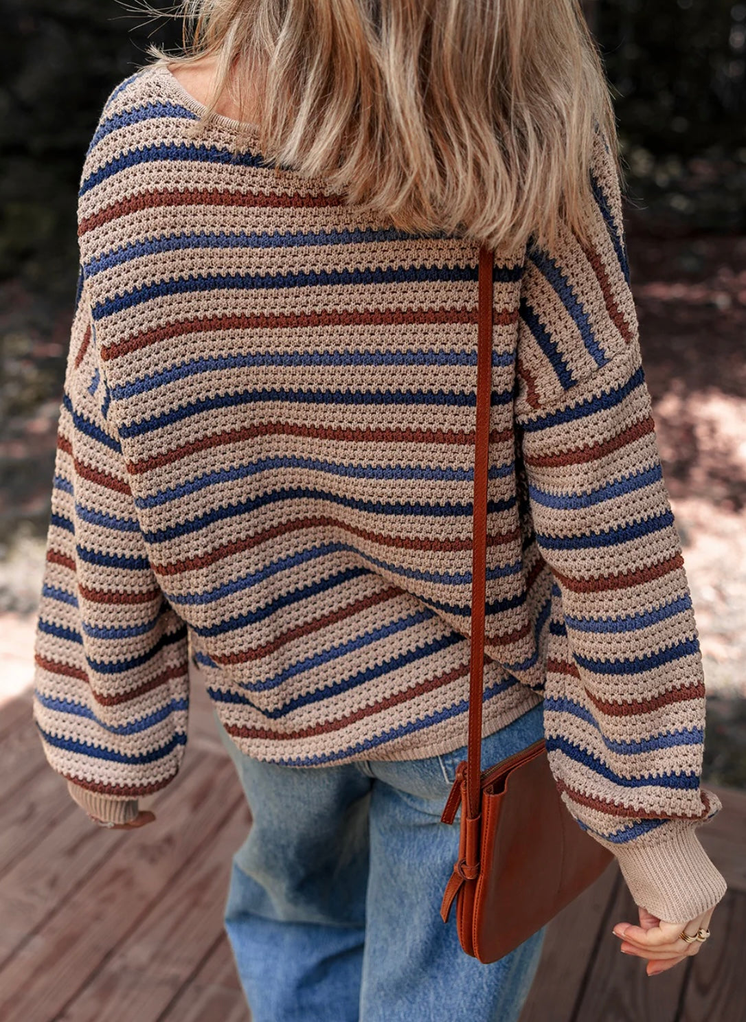 Striped Knitted Drop Shoulder Round Neck Sweater