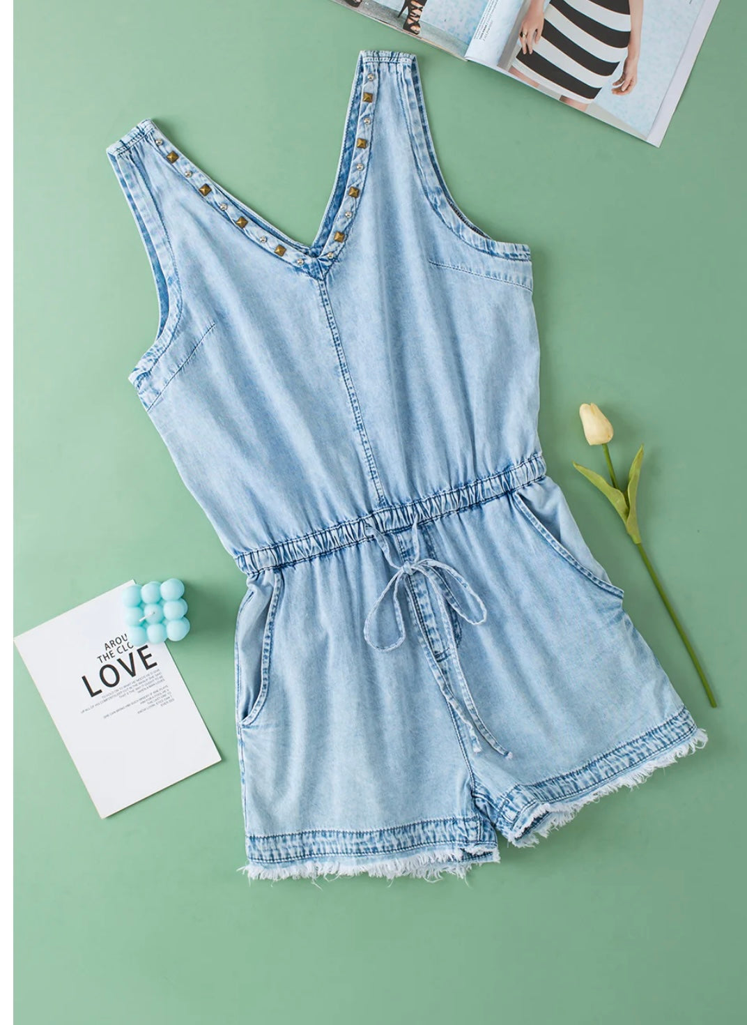 V Neck Raw Hem Denim Romper