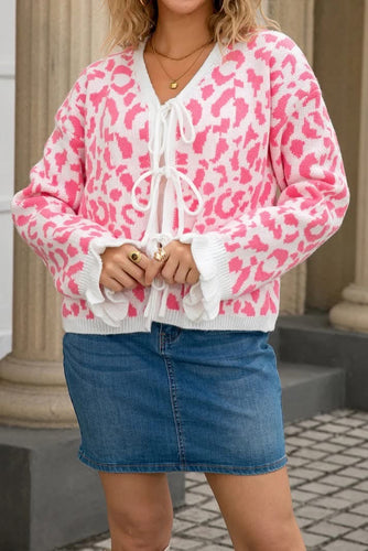 Leopard Print Tie Front Frilled Cuffs Drop Shoulder Sweater Cardigan