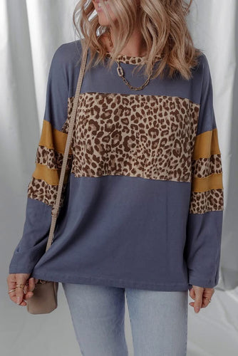 Leopard Colorblock Patchwork Long Sleeve Drop Shoulder Top