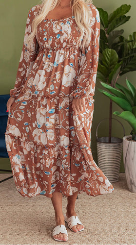 Floral Print Shirred Square Neck High Waist Maxi Dress