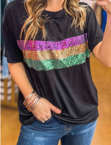 Mardi Gras Sequin Stripes Patchwork T Shirt -Ships 1/16