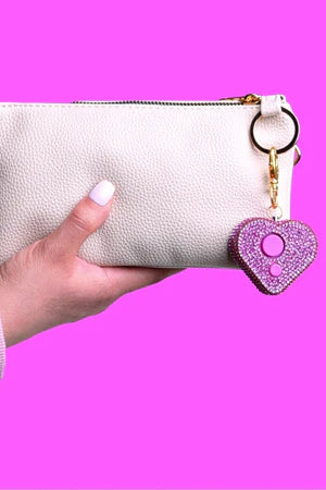 Deter predators wherever you go! This dangerously cute heart keychain is more than just a sparkly bag charm - it's a personal safety alarm! Easily attach to your bag or keys to help keep you safe for campus life, solo trips, late nights and parking lots. When the pin is pulled, a 100 decibel alarm is sounded. Includes a flashlight function for emergencies and small spaces.