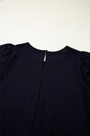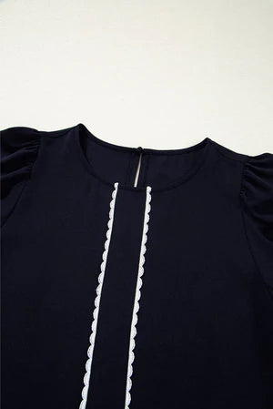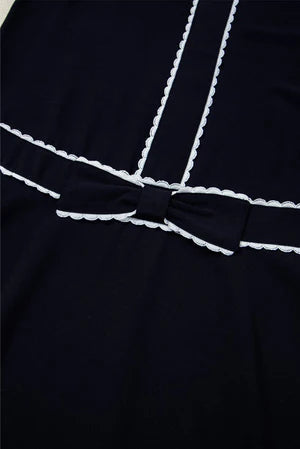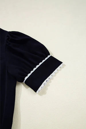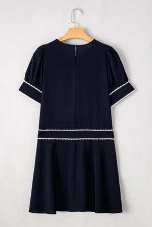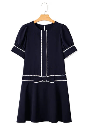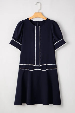Adorned with delicate white scallop trim and a charming bow, this dress exudes sophistication. Convenient pockets and puff sleeves add practicality and elegance. Perfect for a night out or a special occasion.
